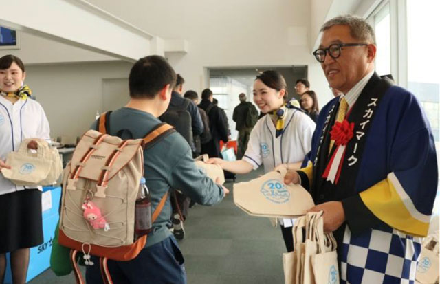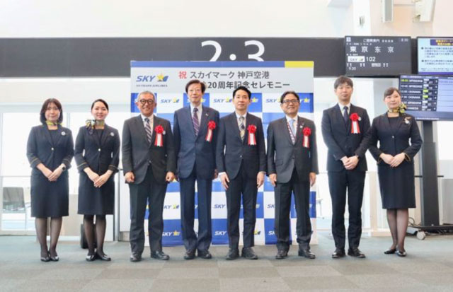 スカイマーク(SKY/BC、9204)は2月16日、神戸空港就航20周年を迎えたことを記念し、セレモニーを開いた。対象便の乗客に記念品を配布したほか、商店街やポートライナーと連携したキャンペーンも始め、神戸を西の拠点とする姿勢を改めて打ち出した。