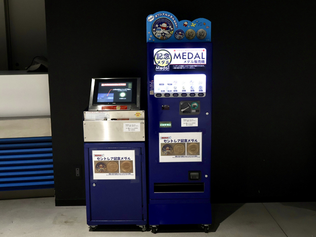 セントレアのフライト・オブ・ドリームズに設置されたメダル刻印機(左)と販売機(同空港提供)