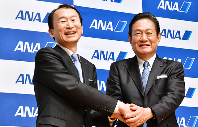 社長交代会見で握手を交わすANAの平澤寿一新社長(左)と井上慎一社長=26月3月2日 PHOTO: Yusuke KOHASE/Aviation Wire