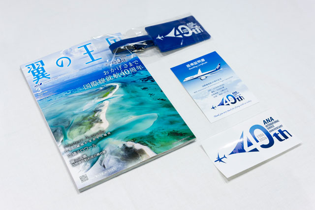 ANA国際線就航40周年の記念品と翼の王国3月号(同社提供)