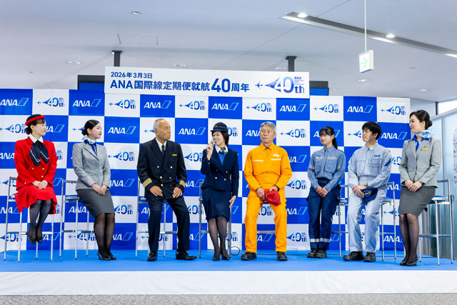全日本空輸(ANA/NH)は3月3日、国際線定期便就航40周年を迎え、成田空港で記念式典を開いた。同社初の国際線定期便は、成田-グアム線だった。