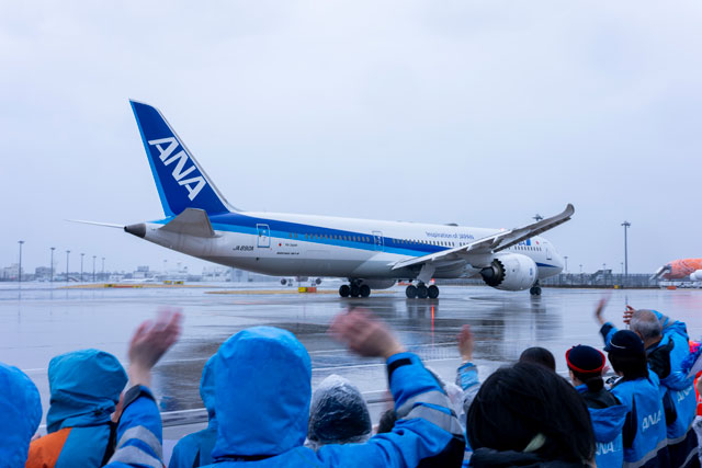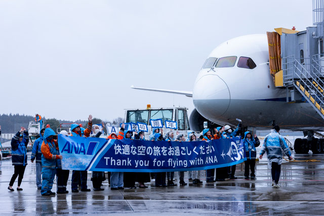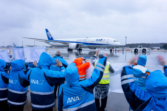 3日は、パース行きNH881便(787-9、登録記号JA890A)が成田の54番スポットを午前11時5分に出発。ANAの井上慎一社長らが乗客に記念ステッカーと搭乗証明書、オリジナルタグをプレゼントし、ランプエリアで社員が横断幕を掲げて見送った。