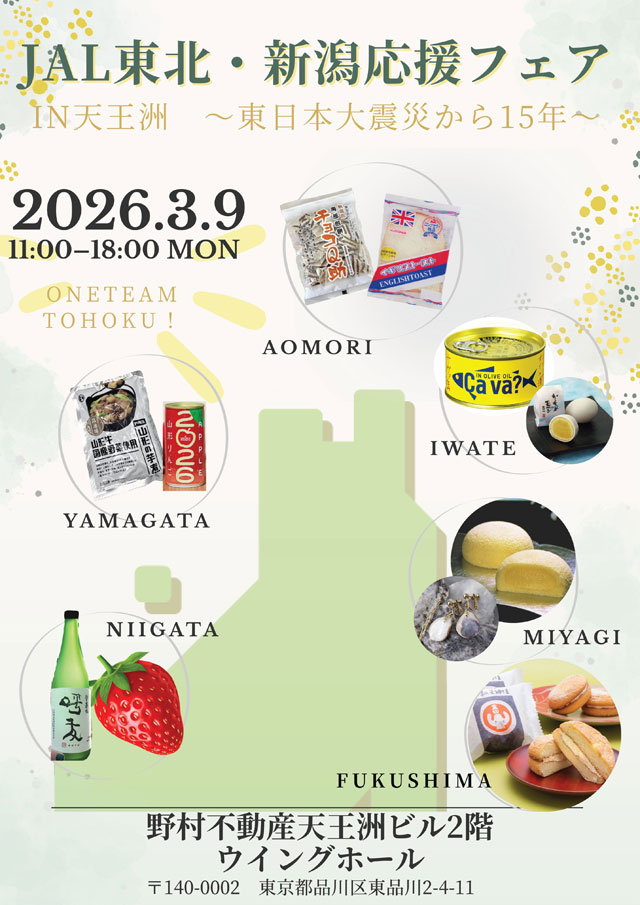 日本航空(JAL/JL、9201)は、東北地方と新潟の名産品を扱う「JAL 東北・新潟応援フェアin天王洲」を3月9日に本社のある野村不動産天王洲ビルで開催する。11日で東日本大震災から15年が経過することから、宮城・福島・岩手・青森・山形・新潟の品々をそろえ、復興支援につなげる。