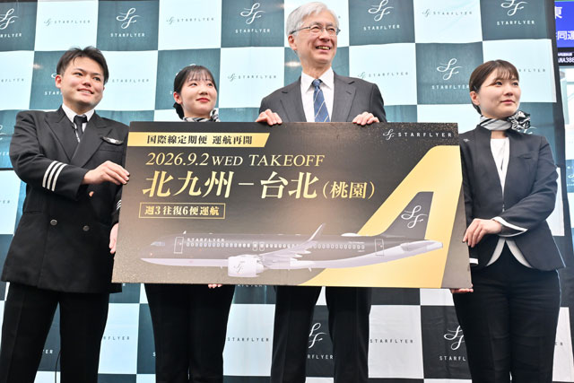 きょう3月16日に就航20周年を迎えたスターフライヤー(SFJ/7G、9206)の町田修社長は、国際線の北九州-台北(桃園)を9月2日から約6年ぶりに再開し、非航空関連事業を強化するため新会社を4月1日に設立すると発表した。