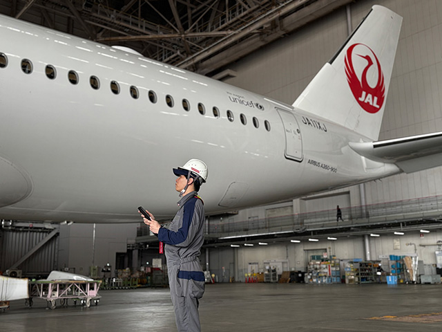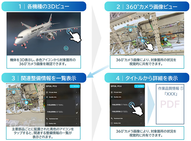 3D技術を用いたソフトウェアを開発するアスカラボ(東京・世田谷区)と共同開発した新システムで、機体の3Dモデルと360度カメラの画像を組み合わせ、バーチャル空間上に実際の整備環境を再現する。整備士は手持ちの端末で整備箇所を確認し、作業に必要な品質情報や技術資料などへアクセスする。