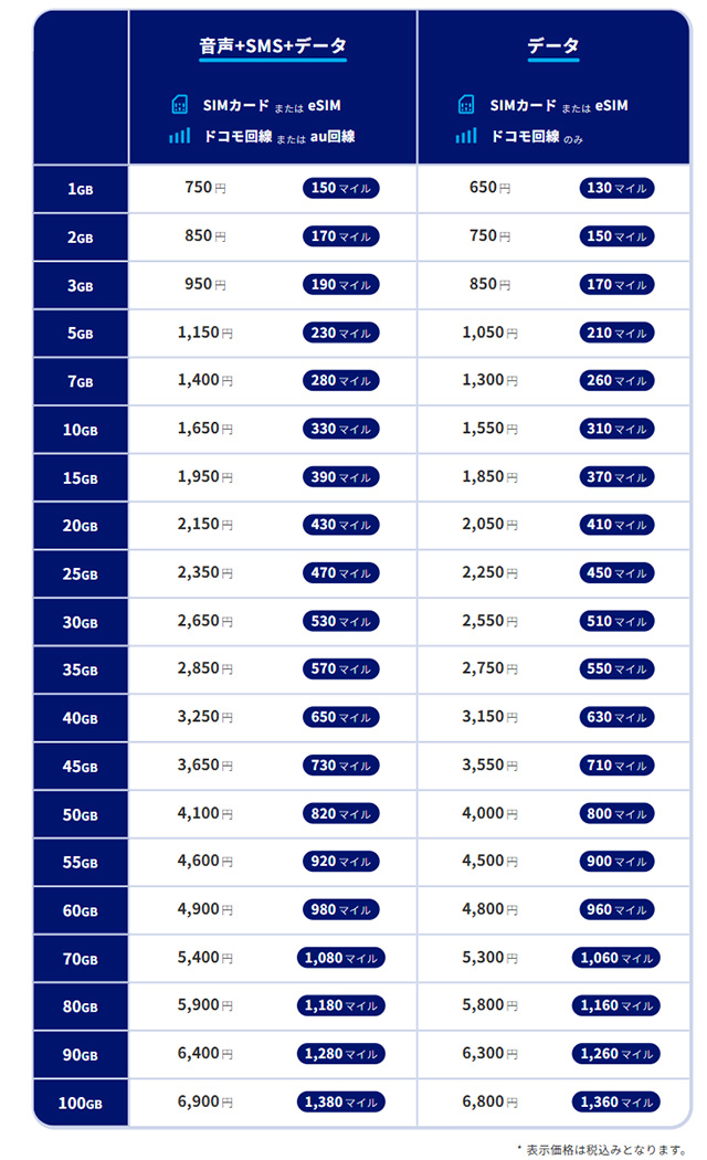 マイルは基本プラン料金と通話定額オプション、データチャージ代が積算対象で、対象額の20%を積算する。