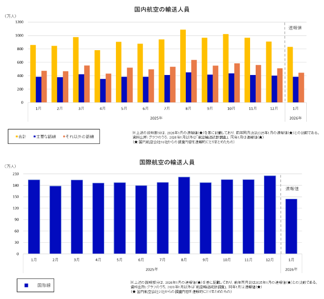 また、同時に発表した2025年12月分の修正値は、国際線が前年同月比9.9%増の205万4000人。国内線は0.9%増の909万7000人で、このうち国内幹線が0.2%減の399万人、国内ローカル線が1.8%増の510万8000人となった。