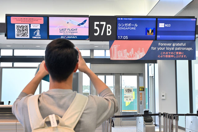 成田空港でAirJapanのシンガポール行き最終便のゲートを撮影する乗客=26年3月28日 PHOTO: Tadayuki YOSHIKAWA/Aviation Wire