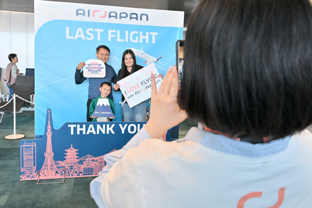成田空港の58Bゲートに用意されたAirJapanのフォトブースで記念殺意する乗客=26年3月28日 PHOTO: Tadayuki YOSHIKAWA/Aviation Wire