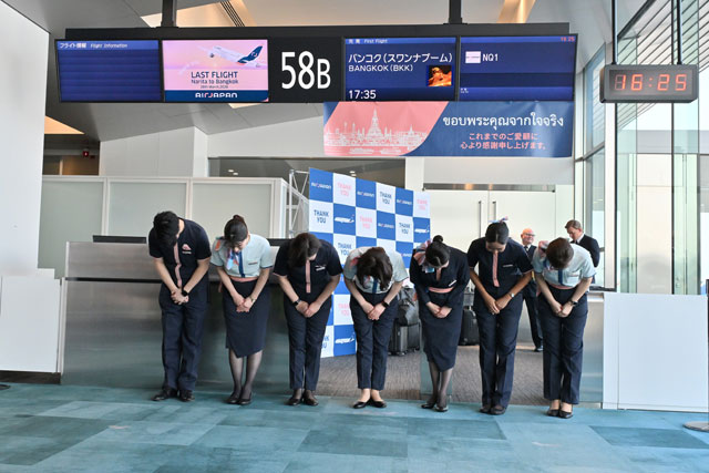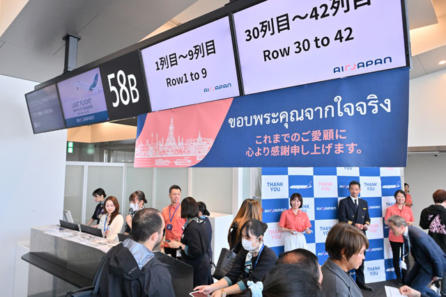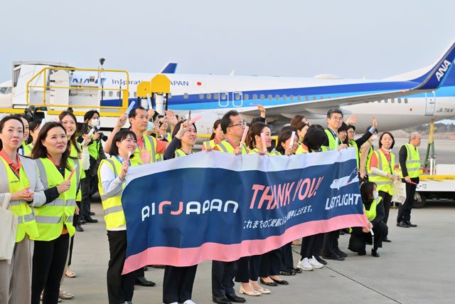 あす3月29日で運航を終えるANAホールディングス(ANAHD、9202)傘下のエアージャパン(AJX/NQ)による自社ブランド「AirJapan」便が28日、成田空港を出発する便の最終日を迎えた。横断幕を手にした社員が、バンコクへ向かう出発最終便を見送った。アジアからのインバウンド(訪日客)をメインターゲットに、2024年2月に就航したが、約2年1カ月で幕を下ろす。エアージャパンは全日本空輸(ANA/NH)の国際線も一部運航しており、コロナ前の運航体制に戻す。