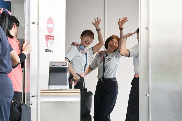 成田空港で搭乗前に手を振るAirJapanのバンコク行きNQ1便の客室乗務員=26年3月28日 PHOTO: Tadayuki YOSHIKAWA/Aviation Wire