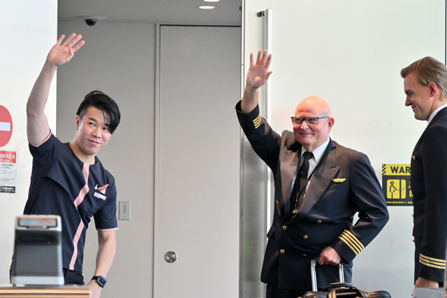 成田空港で搭乗前に手を振るAirJapanのバンコク行きNQ1便の機長(中央)と客室乗務員=26年3月28日 PHOTO: Tadayuki YOSHIKAWA/Aviation Wire