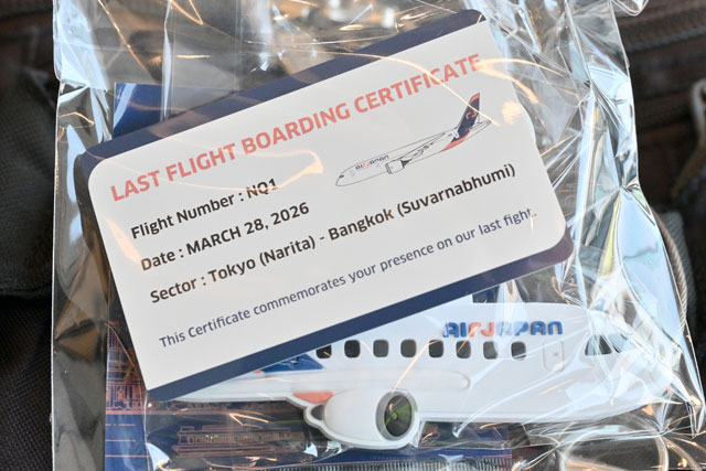 AirJapanの成田発最終便となったバンコク行きNQ1便の乗客に手渡された記念品=26年3月28日 PHOTO: Tadayuki YOSHIKAWA/Aviation Wire