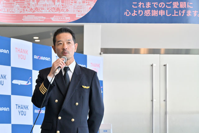 成田空港の58Bゲートで開かれたAirJapan便の成田発最終便記念式典で社員を代表し挨拶するエアージャパンの道廣直幹運航部長=26年3月28日 PHOTO: Tadayuki YOSHIKAWA/Aviation Wire