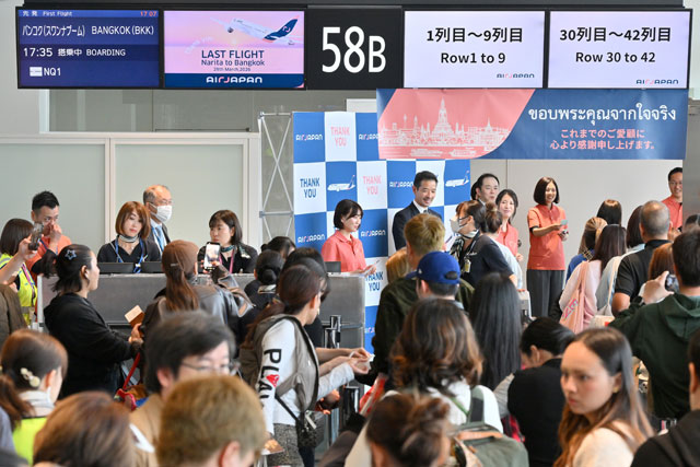 AirJapanの成田発最終便となったバンコク行きNQ1便に搭乗する乗客=26年3月28日 PHOTO: Tadayuki YOSHIKAWA/Aviation Wire