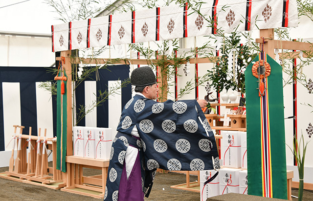 CPSの起工式で「切麻散米」を行う神職=26年3月30日 PHOTO: Yusuke KOHASE/Aviation Wire
