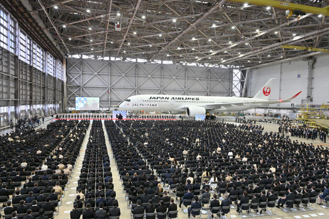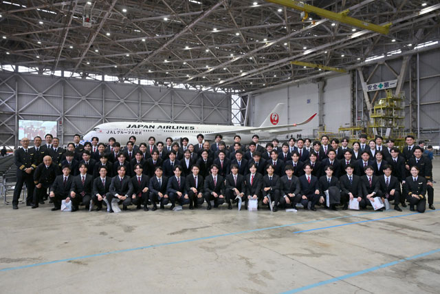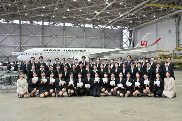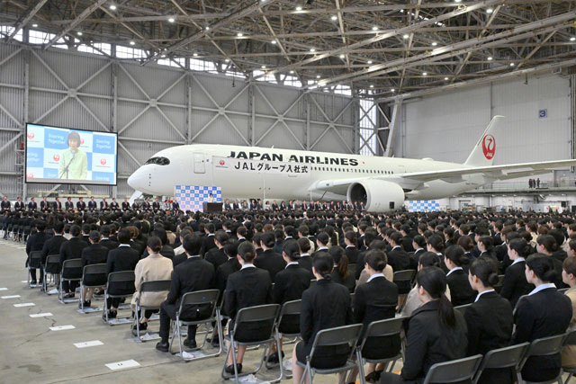 式典後には新入社員たちが恒例となった折り紙ヒコーキを飛ばし、エアバスA350-900型機(登録記号JA16XJ)を背景に記念撮影する姿がみられた。