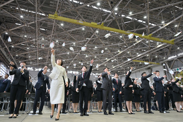 日本航空(JAL/JL、9201)は4月1日、グループ合同の入社式を羽田空港の格納庫で開いた。グループ43社2375人の新入社員が集まり、閉式後は恒例の折り紙ヒコーキ飛ばしも実施した。