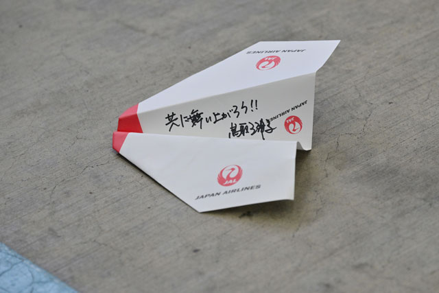 羽田空港の格納庫で開かれたJALグループの入社式で鳥取三津子社長が飛ばした折り紙ヒコーキ=26年4月1日 PHOTO: Tadayuki YOSHIKAWA/Aviation Wire