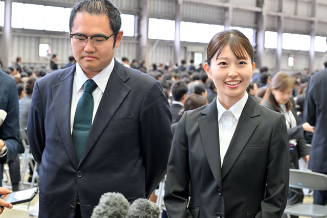 新入社員代表として宣誓したのは、ZIPAIR(ジップエア、TZP/ZG)総合職の新井啓太さんと、JAL客室乗務職の武智万由子さん。新井さんは、航空会社が移動手段からデジタルとリアルをつなぐプラットフォームへ進化していくとし「新しい当たり前を作ること」を成し遂げたいと語った。武智さんは、学生時代に薬学を専攻し、薬剤師実習で命を預かる責任の重さを実感した経験に触れ、「お客様一人ひとりに寄り添いながら安全を第一に行動する姿勢」を大切にすると誓った。