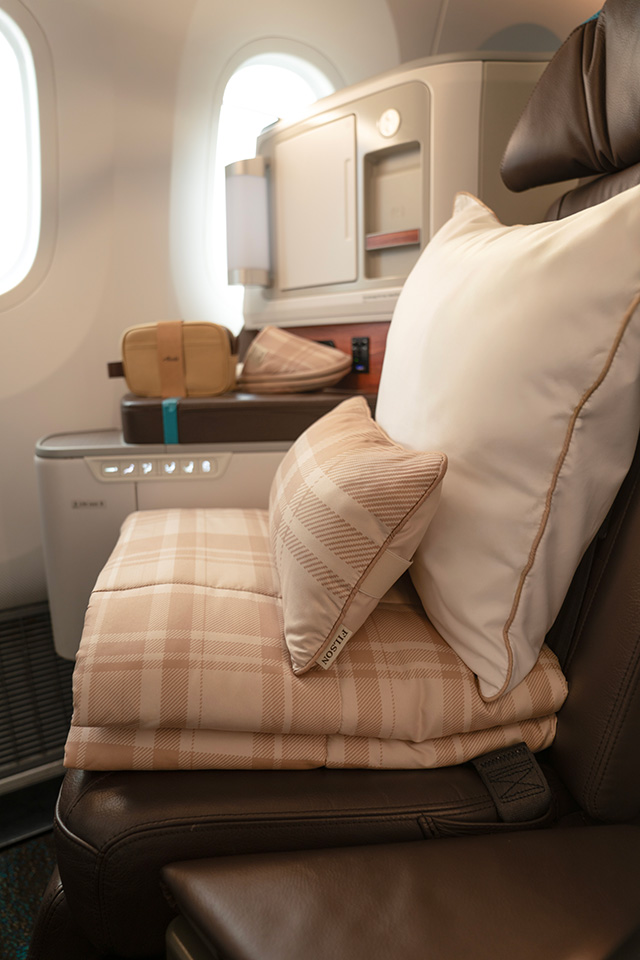 アラスカ航空の787-9ビジネスクラスで始める「国際線ビジネスクラス・スイート」で提供する寝具とアメニティ(同社提供)