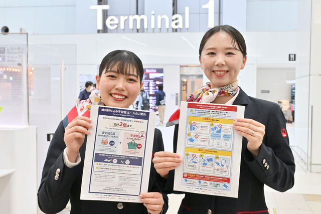 羽田空港でモバイルバッテリー(右)や機内持込手荷物の新ルールを知らせるチラシを手にするJALのグランドスタッフ=26年4月14日 PHOTO: Tadayuki YOSHIKAWA/Aviation Wire