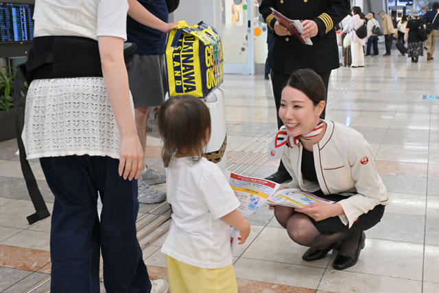 羽田空港でモバイルバッテリーの新ルールを知らせるチラシを家族連れに手渡すJALの客室乗務員ら=26年4月14日 PHOTO: Tadayuki YOSHIKAWA/Aviation Wire