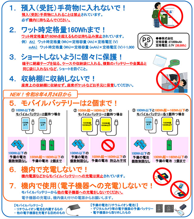 これまでもモバイルバッテリーを空港のカウンターなどで預ける「預け入れ(受託)手荷物」に入れることや、160Whを超えるものの持ち込みは禁止しており、ショート防止のため個別に保護し、座席上の手荷物収納棚(オーバーヘッドビン)ではなく、座席前のポケットなど手元で保管するよう求めている。