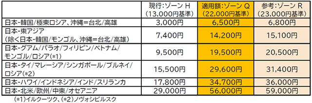2-3月の平均では、円換算したシンガポールケロシン市況が2万3076円となり、従来の上限「ゾーンO(2万円基準)」を超えた。このため、新たに「ゾーンPからR」を追加した。一方で、政府の緊急的激変緩和措置による補助の効果を反映し、5-6月発券分は本来のゾーンRではなく、1段階下の「ゾーンQ(2万2000円基準)」を適用した。