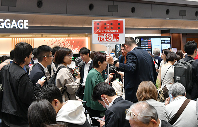 羽田空港第2ターミナルで欠航便の対応に追われるANAの地上係員=26年4月21日 PHOTO: Yusuke KOHASE/Aviation Wire