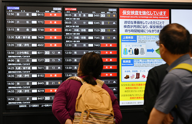 羽田のターミナルを運営する日本空港ビルデング(9706)によると、午後1時50分時点で国内線は出発・到着合わせて206便に欠航や遅延が発生。方面別で見ると、出発便は北海道方面が24便、東北が8便、中部が4便、近畿が13便、四国が13便、中国が10便、九州が38便、沖縄が7便の合わせて117便に影響が出ている。到着便は北海道方面が17便、東北が5便、中部が3便、近畿が13便、四国が9便、中国が9便、九州が30便、沖縄が3便の計89便となっている。