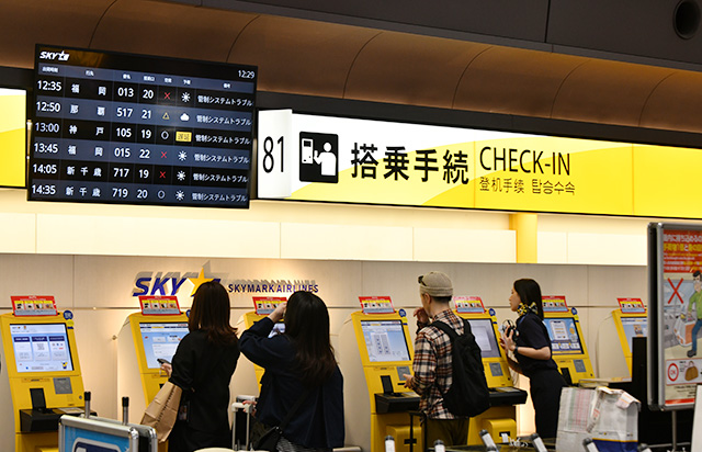 遅延便を表示する羽田空港第1ターミナルにあるスカイマークの出発案内モニター=26年4月21日 PHOTO: Yusuke KOHASE/Aviation Wire