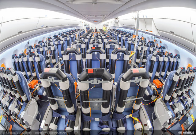 エアバス機の客室はすべて、ハンブルクのエンジニアリング、研究チームによって開発されている。試験機に装備された新しい客室により、A350 XWBの幅広い胴体が乗客一人ひとりにより広いスペースを提供し、ビジネス、エコノミー・クラスの客室に高い柔軟性と快適性をもたらし、エコノミー・クラスで横9列18インチ(45.7センチ)幅のゆとりあるシートを備えられることを実証する。