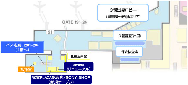 国際線制限エリア3階の免税店南館では、家電専門店「家電プラザ総合店」が営業を開始。海外仕様の電化製品を取り扱う。既存店のドラッグストア「アマノ」が店舗面積を1.5倍に拡大しリニューアル。医薬品や食品、トラベル用品などを取りそろえる。どちらも営業時間は、午前7時30分から午後4時30分まで。