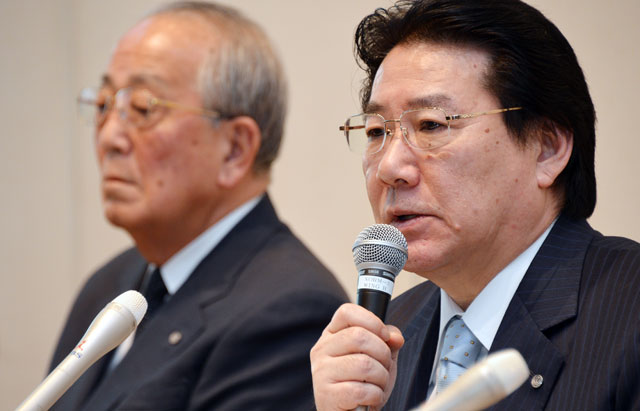 12年3月期決算を報告するJALの植木社長(右)と稲盛名誉会長=5月14日 PHOTO: Tadayuki YOSHIKAWA/Aviation Wire
