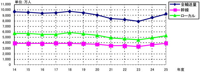 2002年度(平成14年度)から13年度(25年度)までの国内線旅客数の推移(国交省航空輸送統計から)