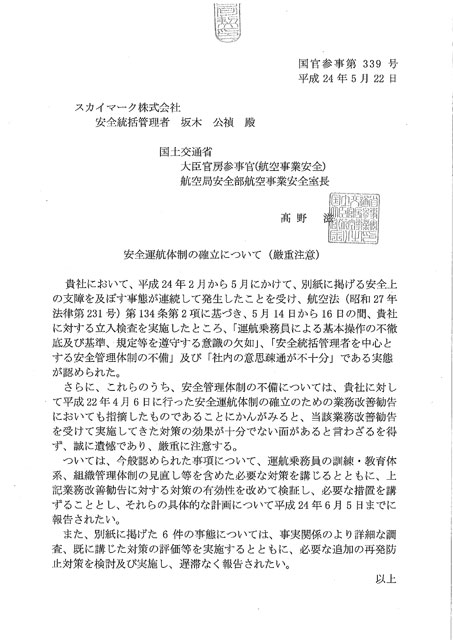 国土交通省は5月22日、スカイマーク(SKY)に対して今月行った立ち入り検査で安全運航体制に不備が見つかったとして文書で厳重注意を行った。