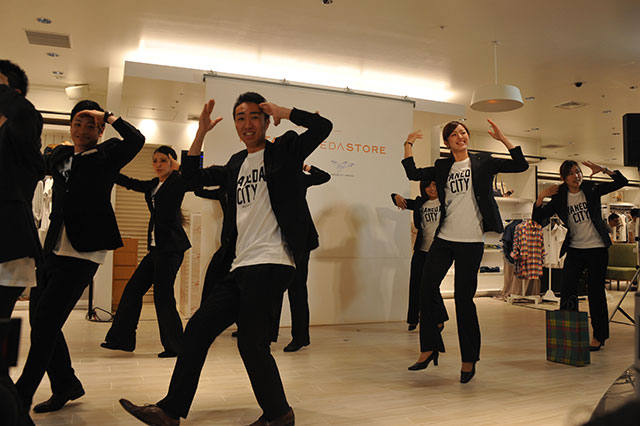 その後、従業員たちがサプライズでダンスを披露。それぞれのショップの制服のまま約5分間踊り続けた。踊りの輪の中には、大西社長も加わり、開業を祝った。