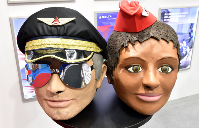 デルタ航空が用意するパイロットと客室乗務員のお面=9月26日 PHOTO: Tadayuki YOSHIKAWA/Aviation Wire