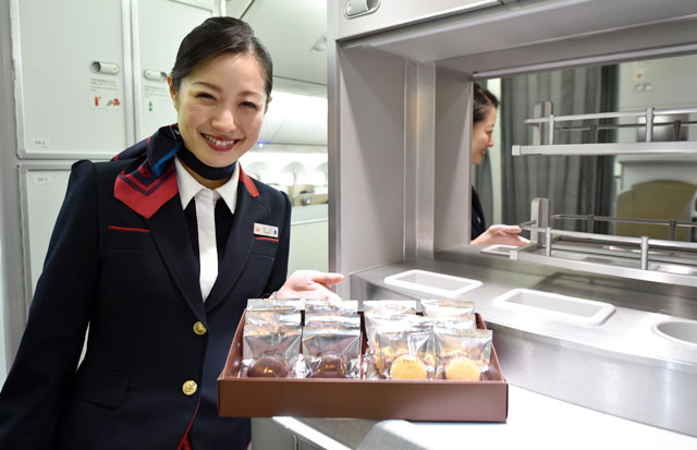 ビジネスクラス向けの菓子を紹介する客室乗務員=11月29日 PHOTO: Tadayuki YOSHIKAWA/Aviation Wire