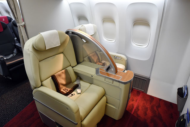 JALの国内線用767に新設されたファーストクラスのシート=12月7日 PHOTO: Tadayuki YOSHIKAWA/Aviation Wire