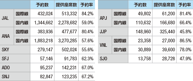 ANAの予約数は国際線が前年比22.1%増の38万3936人で、国内線は0.2%減の188万3218人。提供座席数は国際線が13.3%増の47万7677席で、国内線は1.9%減の327万285席となった。