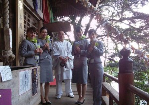 文殊仙寺で祈祷したしおりを手にするソラシド エアのスタッフ(同社提供)