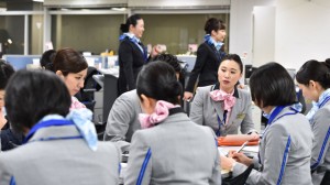 ブリーフィングする新制服初便の客室乗務員と旧制服を着用した客室乗務員=1月31日 PHOTO: Tadayuki YOSHIKAWA/Aviation Wire