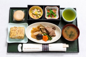 国内線ファーストクラスの機内食は、大津市の懐石・割烹「清元」の主人、清本健次氏がプロデュース。近江牛や近江豚、琵琶湖で獲れるタテボシガイやニジマスなど、地元の食材を使用したメニューを用意する。ご飯は近江米の新品種「みずかがみ」を使用。午後5時以降の出発便を対象に、上旬、中旬、下旬で異なるメニューを用意する。午後4時那覇発羽田行きJL918便でも提供する。