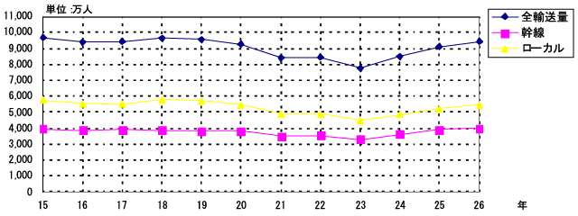 2003年(平成15年)から14年(26年)までの国内線旅客数の推移(国交省航空輸送統計から)