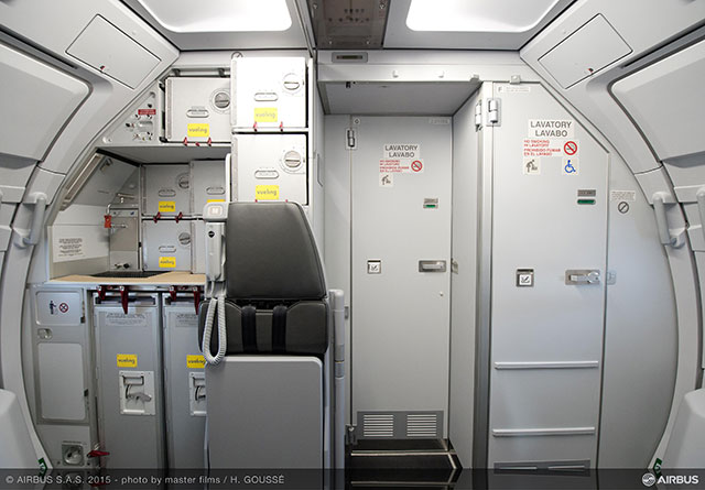 スペース・フレックスはA320ファミリー向け客室オプションで、機体後部のラバトリー(化粧室)やギャレー(厨房設備)を効率の良い新レイアウトで配置。座席は従来の180席から6席増の186席で、シート幅は18インチ(45.72センチ)としている。