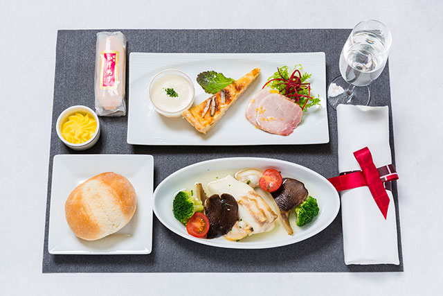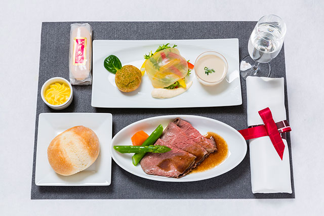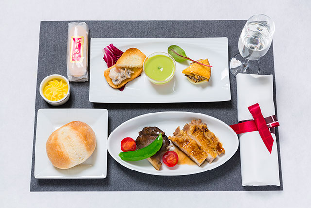 午後5時以降の出発便を対象に、上旬、中旬、下旬で異なるメニューを用意する。午後3時50分那覇発羽田行きJL914便でも提供する。