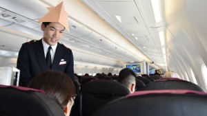 こいのぼりフライトで機内サービスする客室乗務員=5月5日 PHOTO: Tadayuki YOSHIKAWA/Aviation Wire