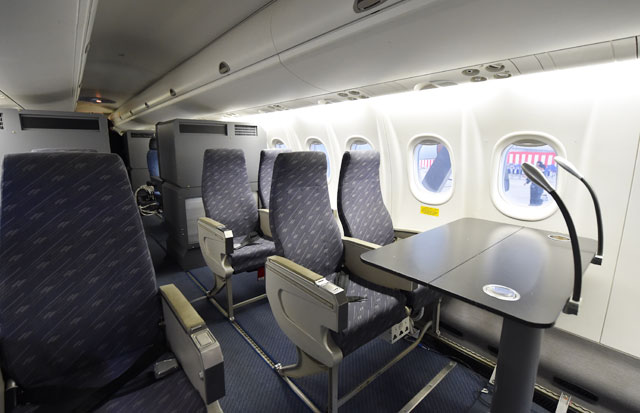 飛行検査機Q300の前方座席と大型テーブル=5月16日 PHOTO: Tadayuki YOSHIKAWA/Aviation Wire